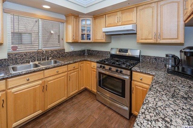 Updated & spacious townhouse for sale in Van Nuys adjacent to Valley Glen & close proximity to Valley Village | Kitchen has tile flooring to match the look & color of the Pergo flooring throughout the unit, newer cabinets, granite counters, recessed lighting & breakfast bar open to the living area | The fireplace in the living room is the central focus point of large great room that leads to the first of two balconies facing the street & enclosed by trees in front of the building for privacy without losing natural light | There is a guest powder room downstairs with sink & toilet only | Side by side washer dryer hookups upstairs in the hallway closet between bedrooms with skylight overhead | 2 master bedroom suites upstairs | First bedroom has a balcony, walk in closet, recessed lighting, ensuite bathroom featuring double sink vanity, full tub with shower overhead & glass sliding door | 2nd bedroom has wall to wall closet, recessed lighting, ensuite bathroom with full tub with shower overhead & glass sliding door | Central air & heat with Nest thermostat | Low HOA of only $252 which includes water | Smaller complex with only 10 total units | 2 assigned tandem parking spots in a garage with extra private storage area | Welcome home to 6420 Hazeltine Ave!