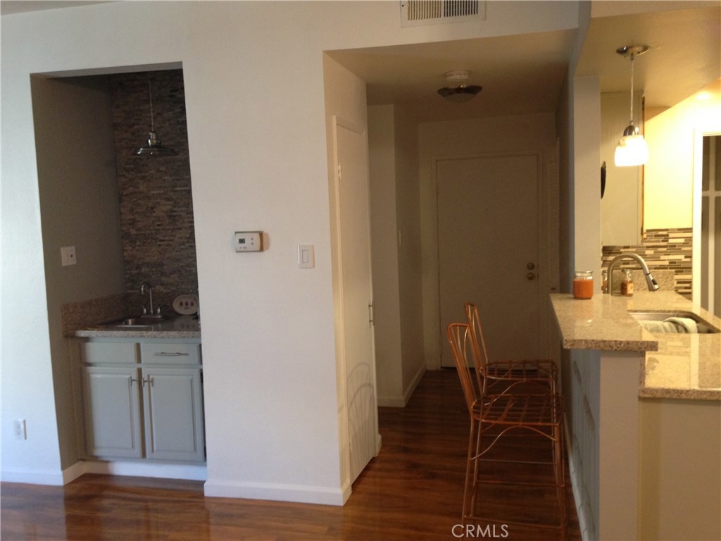 Beautifully remodeled condo in Van Nuys! Light and bright living room with laminate wood floors, gas fireplace, sliding glass door that leads to balcony overlooking the pool area. kitchen updated with granite counter tops, stainless steel appliances and separate room with stackable washer and dryer. Spacious dining area open to living room with custom wet bar. Spacious bedroom with walk-in closet, bathroom features vanity with granite counter tops, elegant light fixtures. Second bedroom is completely separate and private. Additional features include laminate wood flooring throughout, recessed lighting, brand new HVAC and two side-by-side parking spaces. Grace Greens complex features security cameras, controlled access, sparkling pool, meeting room and gym with sauna. A great opportunity!