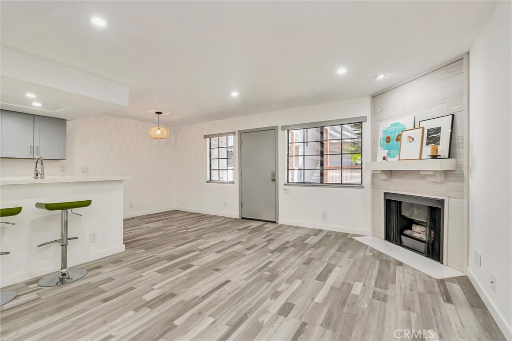 Every inch of this gorgeous condo has been COMPLETELY remodeled! The amazing Kitchen has Quartz counters, Samsung SS appliances including a 4 burner stove with a griddle, 3-door refrigerator, dishwasher and built-in microwave, walk-in pantry, and breakfast bar, with an adjacent eating area, all open to the spacious Living Room with an electric fireplace. The ample-sized bedroom has a walk-in closet with organizers. The beautiful full bathroom has quartz counters and floor-to-ceiling linen cabinets. There are brand new vinyl plank floors throughout the home as well as new window treatments, high ceilings, recessed lights (all with LED), and a stacked washer/dryer. The subterranean garage offers 2 tandem parking places and the complex has a security gate for your safety. Bring your toothbrush and move in!