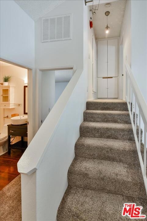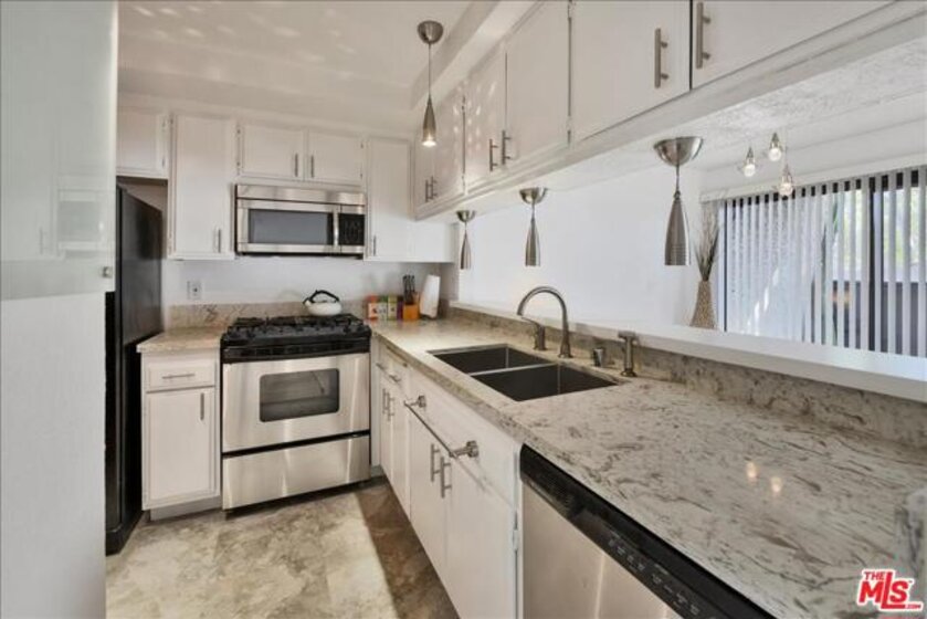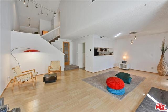 Welcome to the sought-after Parkwood. Resort living at its best with parklike grounds, inviting pool, two spas, a gym, saunas, and clubhouse that can be reserved for private parties. This dramatic tri-level 2-bdrm, 2 ba home in the rear of this quiet complex with only 2 common walls. The kitchen is updated with granite counters and SS appliances. There are vaulted ceilings creating a dramatic look and wood-like floors throughout. In addition to the huge private storage room in the garage, there is plenty of closet space in the unit. 2 balconies, one off the dining room allows for indoor/outdoor entertaining, and one off the main bedroom suite. Ready to move in and make your own. In addition to your 2 car tandem space in the garage, there is also guest parking. The HOA includes earthquake insurance and water.