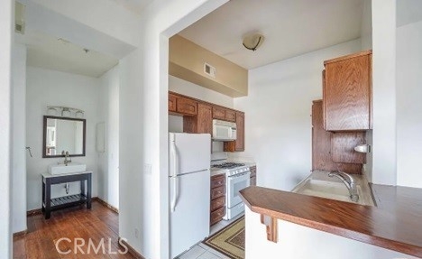 This bright and spacious top-floor 2 bed, 2 bath condo offers a modern and upscale living experience with vaulted ceilings throughout. Step inside to find an open living area with laminated floors throughout the living room and dining room. A cozy fireplace in the living room adds charm and warmth, while the private balcony provides the perfect spot to relax and enjoy the outdoors. The kitchen features tile floors, tile countertops, and wood cabinets. Both carpeted bedrooms are spacious and each includes its own en-suite bathroom for added privacy and generous walk-in closets. The property includes two assigned parking spaces in a gated underground garage. Residents can enjoy a range of amenities, including an out door courtyard with a built-in BBQ, recreation room, and fitness center. Situated near shopping, dining, and transportation, including easy access to the 101, 405, and 170 freeways, this condo is also close to Lake Balboa and Woodley Lakes Golf Course. An ideal home for first-time buyers or an excellent investment opportunity.