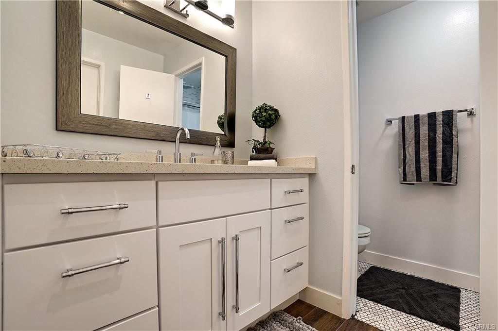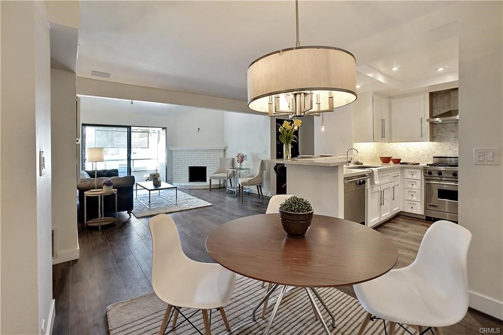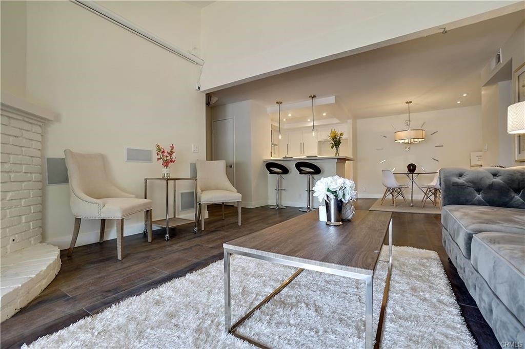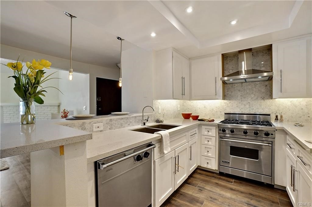 LOVE AT FIRST SIGHT! Beautifully remodeled 2-bedroom, 2-bathroom open concept, upper, single floor condo conveniently located near the 101 and 405 Freeways. Located in the rear of a lovely, gated complex with nice curb appeal. Enjoy a newer, spacious kitchen with Royal White Quartz with Viking Stainless Steel Appliances which opens to the Living Room with vaulted ceilings, a gas fireplace and wood-like laminate floors throughout. Spend your morning enjoying your coffee on the balcony. Relish endless music on the surround sound system and a projector screen to enjoy movies on a large-scale. The Master Ensuite is nice sized with walk-in closet and recessed lights. The guest room has it’s own adjacent remodeled bathroom and recessed lights. In-unit laundry is a must and comes with a washer and dryer. Soak up the sun and spend the afternoon outdoors BBQ’ing and lounging at the pool. Parking is gated and tandem with one covered spot and one uncovered. *Photos from previous listing with staging.