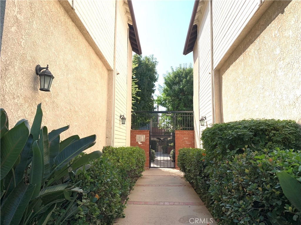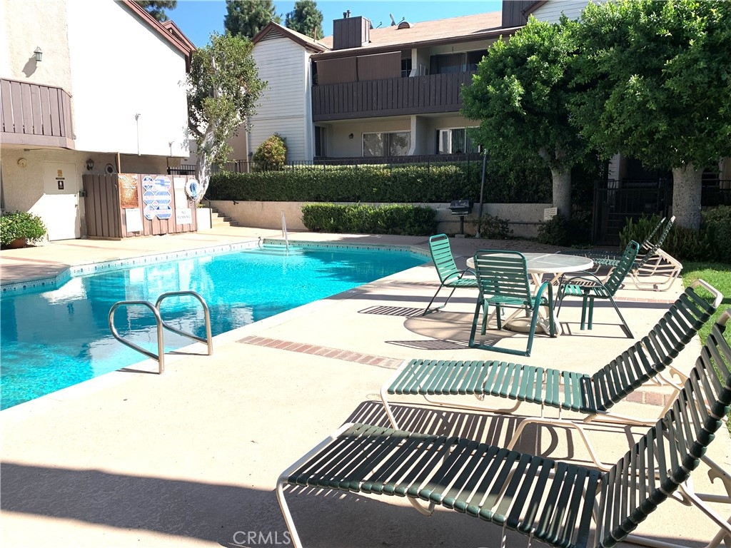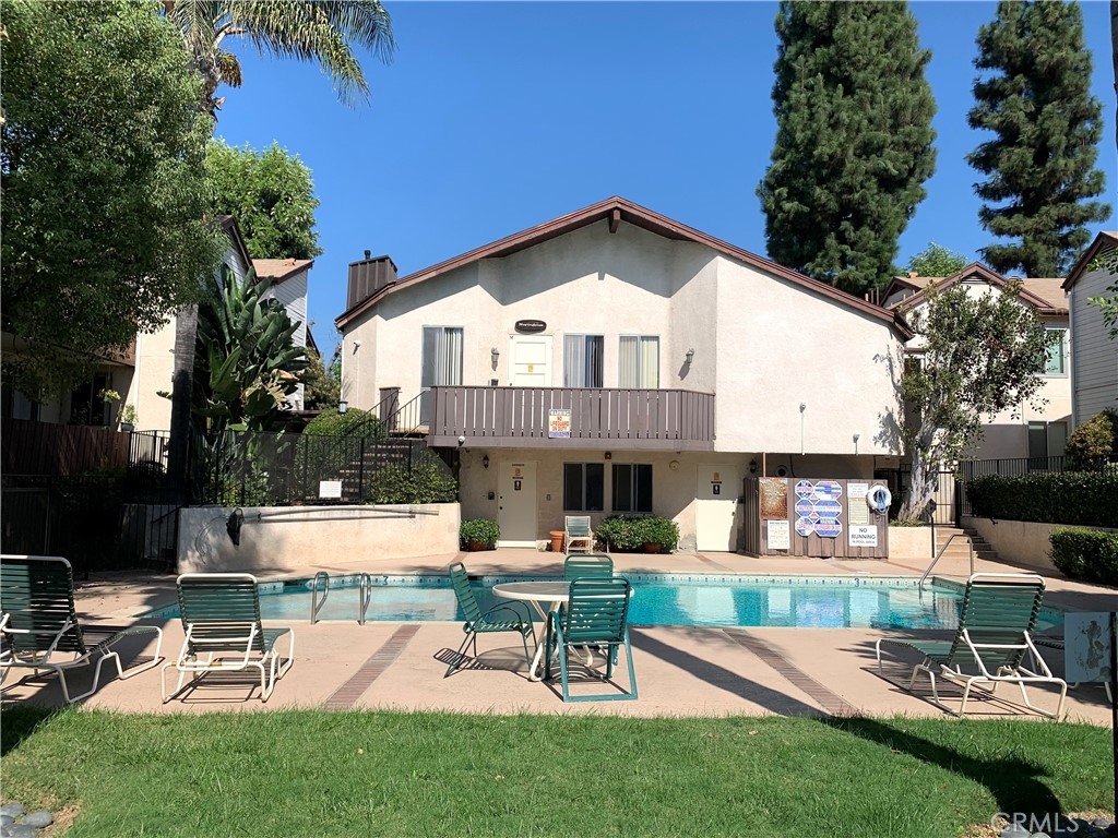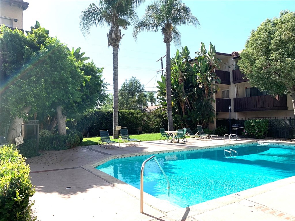 Bright top unit on 2nd level with views above the roof tops. End unit. Open and spacious over 1200 sf. Newly painted throughout. Priced to sell. Sold As Is. Here's your opportunity to upgrade the way you want it. Master bedroom has a walk in closet and cabinets. Living room with balcony, fireplace. Washer/dryer included. New kitchen faucet, New shower faucets and sink faucets in both bathrooms. Newly installed furnace. Complex is gated with lots of guest parking in the back off the alley. There's a beautiful pool and club house. Each unit has a storage room in the garage area. 2 tandem parking spaces.
