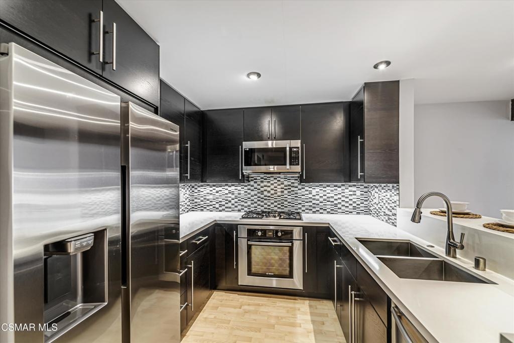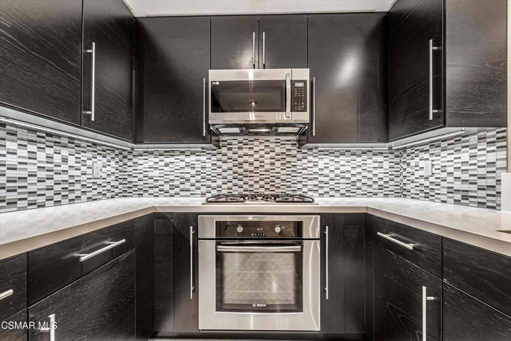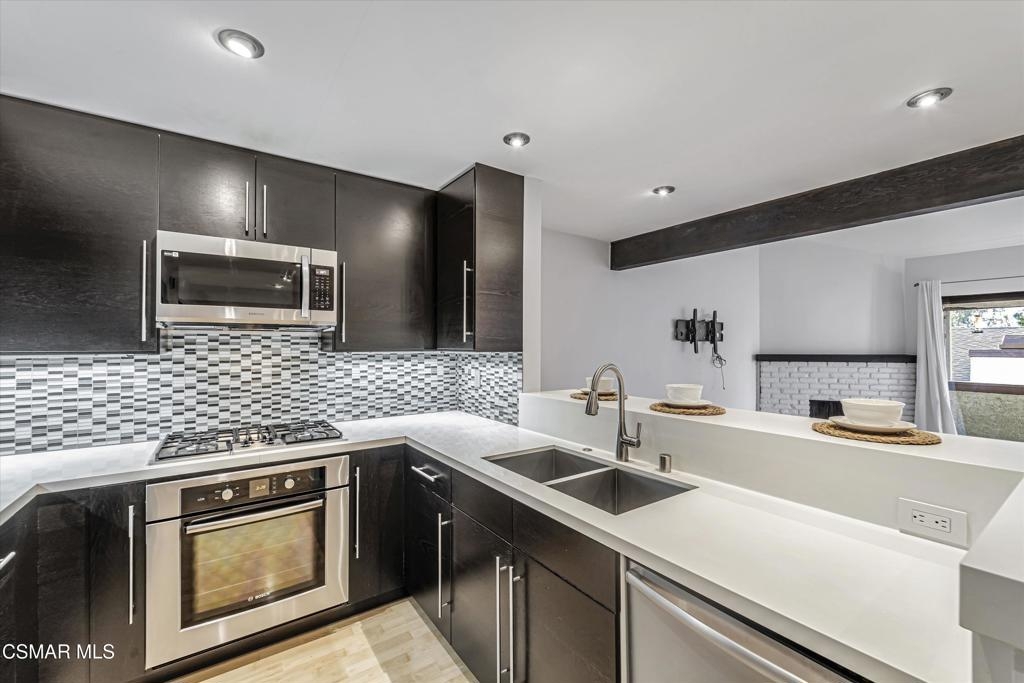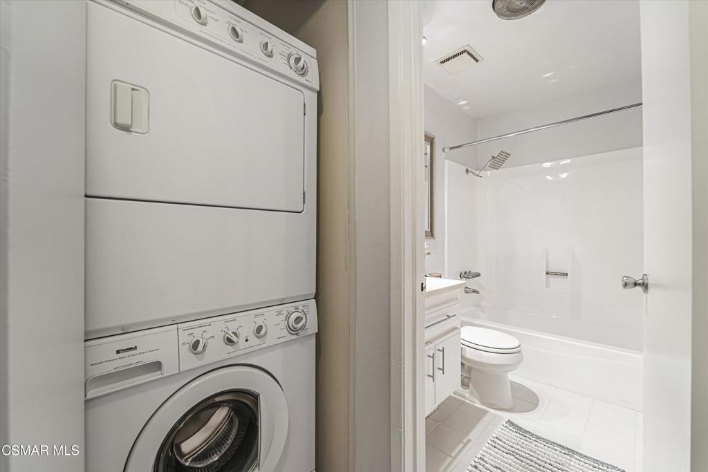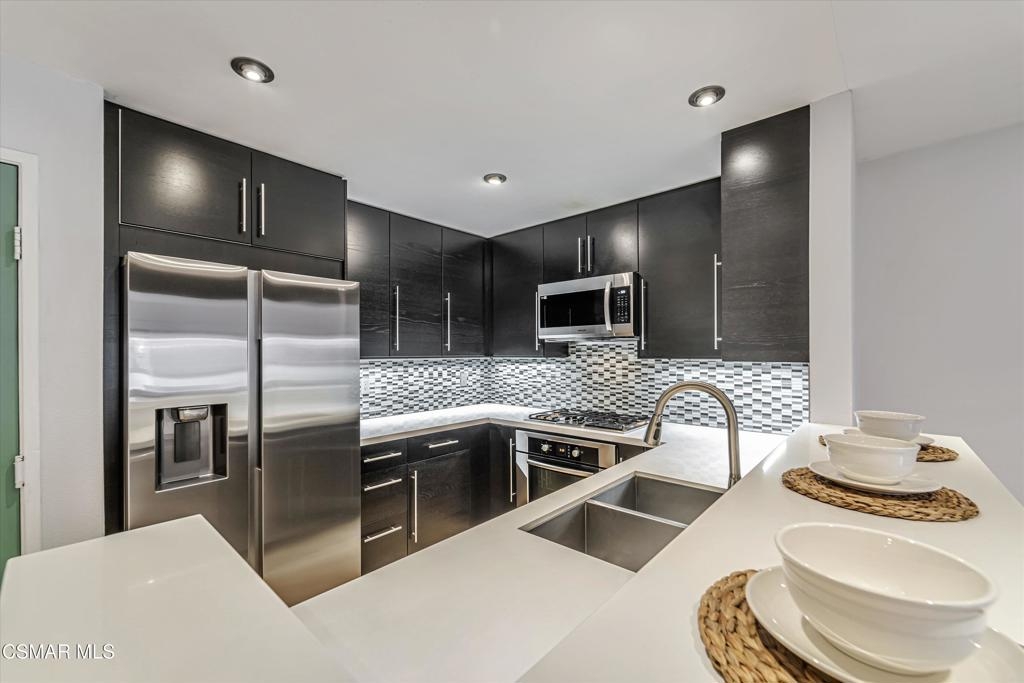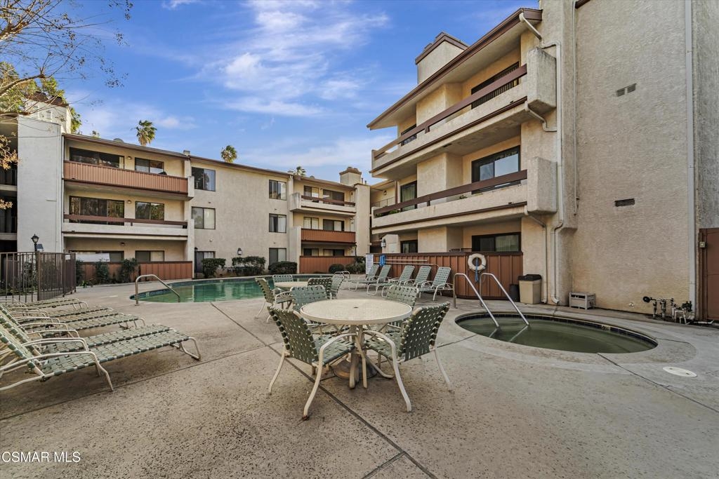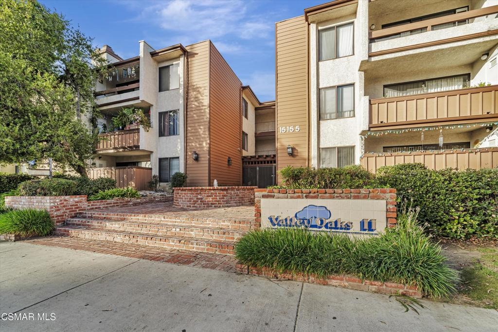 Proudly representing this beautiful, updated top-floor unit with elevator access. It has been cared for with the utmost pride in ownership. It offers 2 bedrooms, 2 bathrooms, high vaulted ceilings, dining room, large living room, private patio, in-unit stackable washer & dryer. Remodeled kitchen with quartz counter tops, micro/convection oven, new Samsung refrigerator and SS Bosch range oven and dishwasher. There is glass mosaic backsplash, swing-out corner shelves and a SS sink. The master bathroom has an upgraded shower. This living room has an exquisite gas fireplace, laminate wood flooring, sliding glass door to the patio. Central A/C and heating. LED recessed lighting. As you step out of the unit you can enjoy a pool, spa, the BBQ area and peaceful walks throughout the large grounds. There are two covered parking spaces. The elevator is located near this unit for easy access. The HOA dues include earthquake insurance, guest parking, water, trash, sewer, and basic cable. Home Sweet Home!