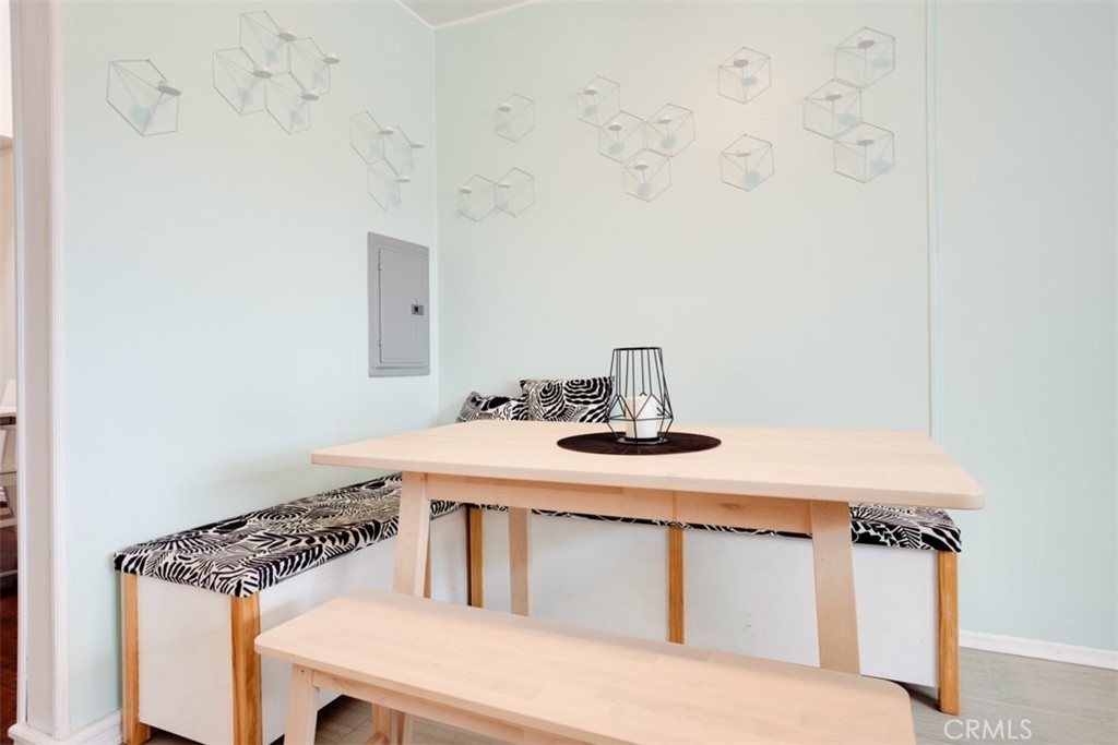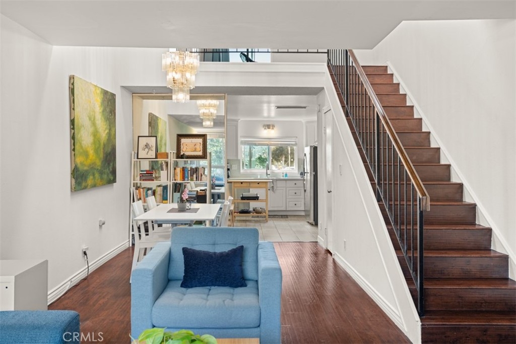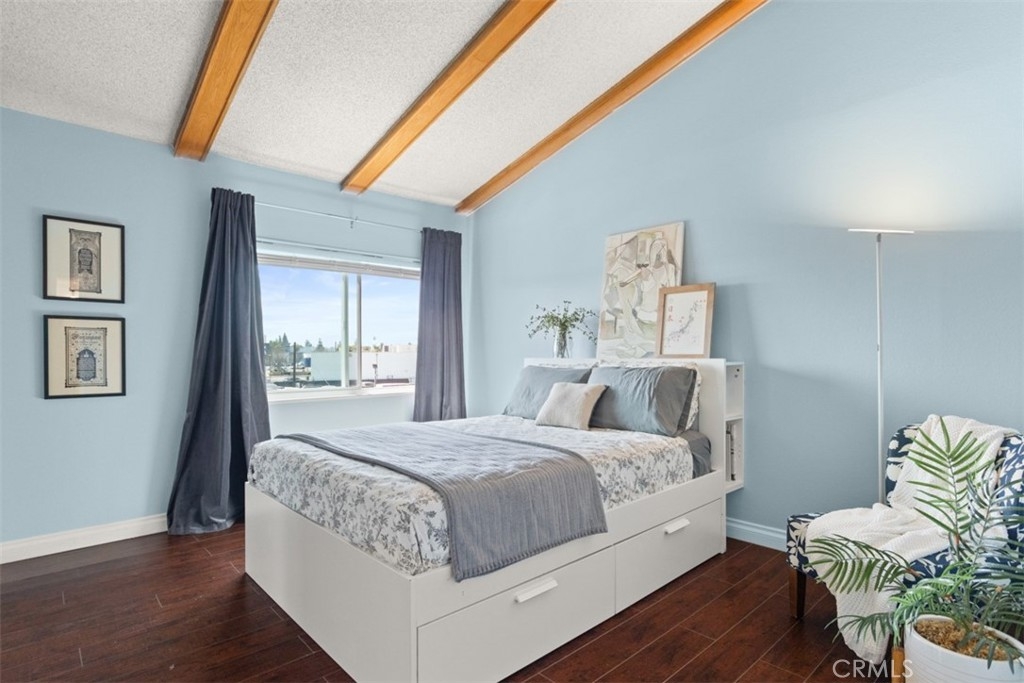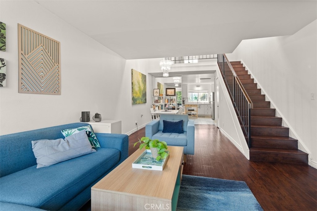 Fall in love with townhouse living in this beautifully updated 2-bedroom, 2-bathroom, 1,079 sq. ft. home. The open floor plan features abundant natural light and a private balcony. The main floor boasts soaring ceilings, an open-concept living and dining area, an impressive half bathroom, and gorgeous flooring. The chef’s kitchen is fully renovated with white shaker cabinets, a stylish tile backsplash, stainless steel appliances, quartz countertops, and ample storage and prep space. The primary suite includes vaulted ceilings with exposed wood beams, a spacious closet, and is adjacent to the fully renovated full bathroom. The AC system was replaced in 2020. The community offers controlled access, a pool, a recreation room, and is conveniently located near laundry facilities with three washers and dryers. Custom design accent walls and creative storage solutions enhance this home, which has too many upgrades to list. Welcome home!