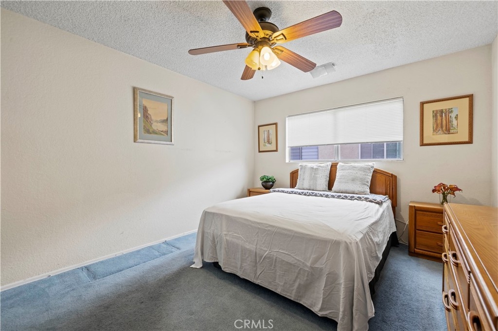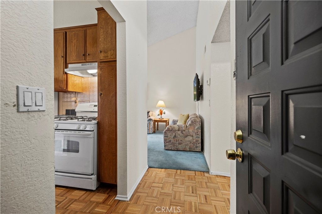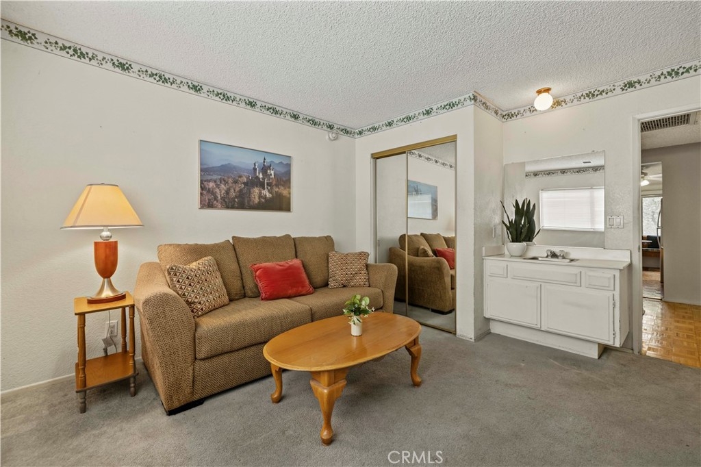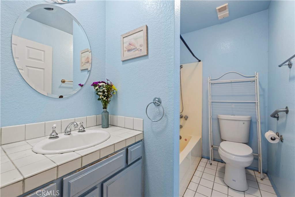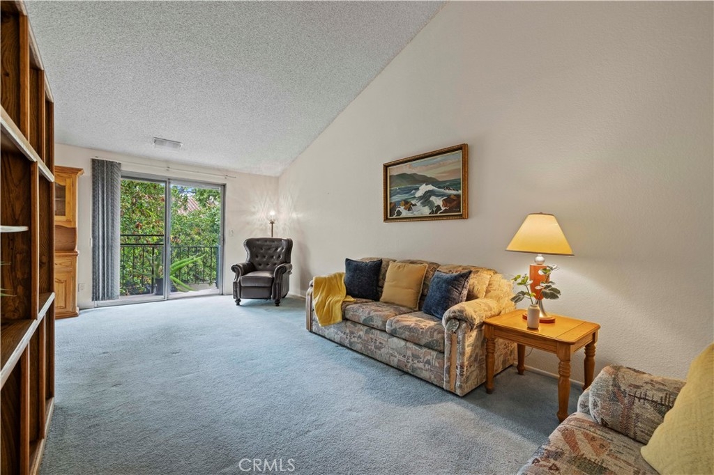 Welcome to this inviting 2-bedroom, 1-bathroom condo offering 859 square feet of comfortable living space in a secure gated community. This upper-level unit features vaulted ceilings and abundant natural light, creating a spacious and airy atmosphere. The open living area flows into a private balcony—perfect for relaxing or enjoying a quiet morning. The kitchen offers ample cabinet space and a breakfast nook for casual dining, making it both functional and welcoming. One bedroom includes a generous walk-in closet, while the second bedroom features its own sink and cabinet space for added convenience. The hallway provides additional storage with ample closet space and built-in cabinets. The full bathroom includes a tub/shower combination. The community offers a swimming pool and spa, guest parking, and a shared garage with a remote-controlled door, individual storage room, and washer/dryer hookups. It is conveniently located near Starbucks, Ralph's Market, and shopping centers, dining, and major commuter routes.